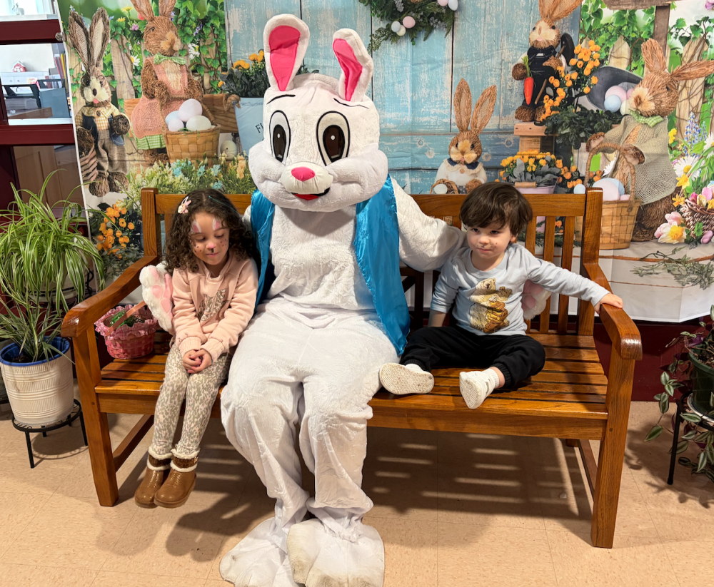 The Easter Bunny with friends Maria Motto, left, and Matthew Motto. Photo by Sandy Quadros Bowles