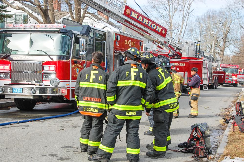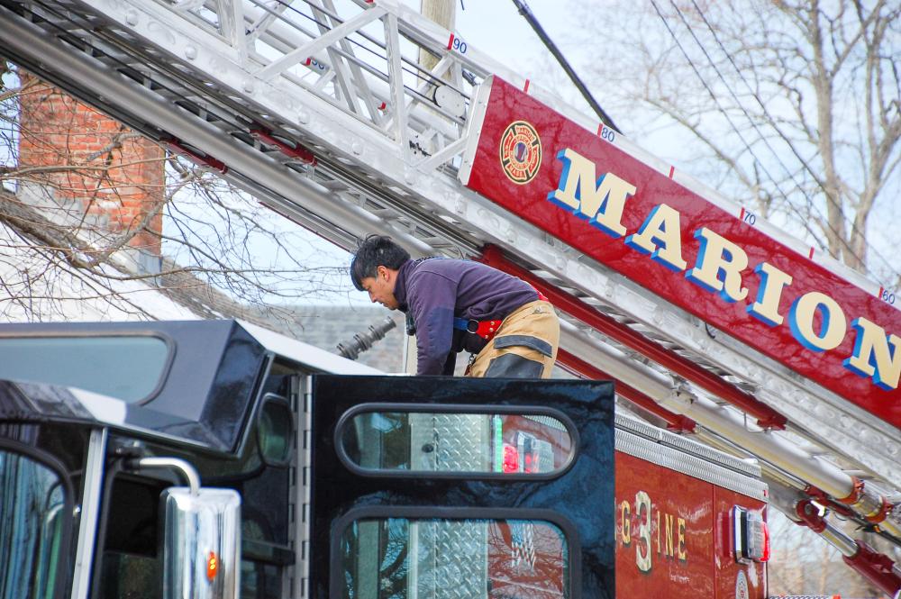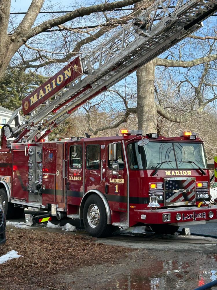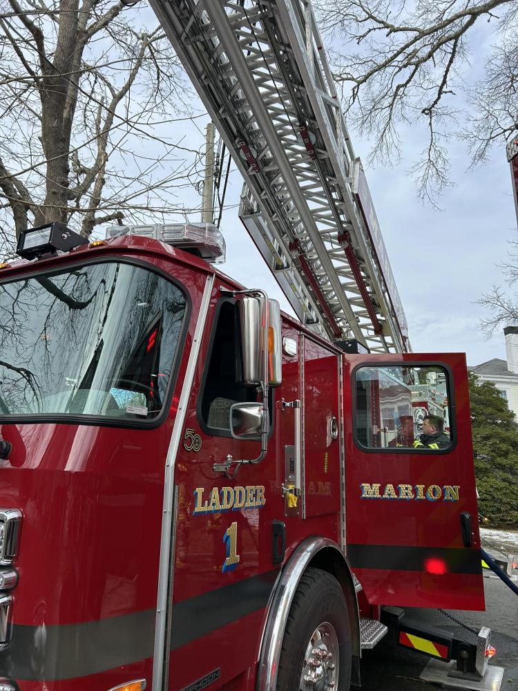 The ladder was extended on the Marion firetruck. Source: Marion Fire Department FacebookMATTAPOISETT — Five fire departments were called to an afternoon structure fire at 5 North Street in Mattapoisett.