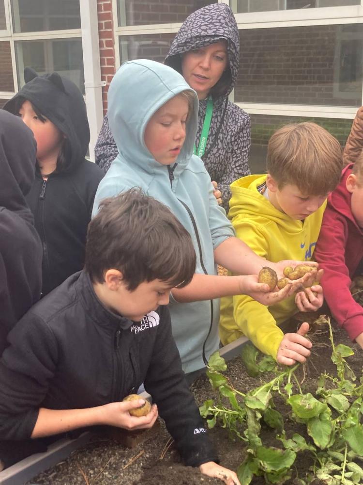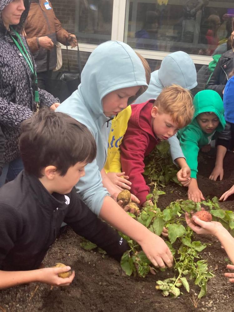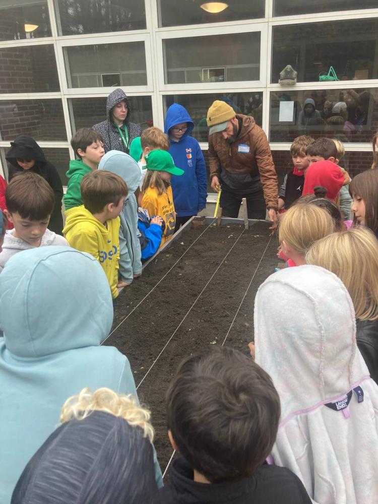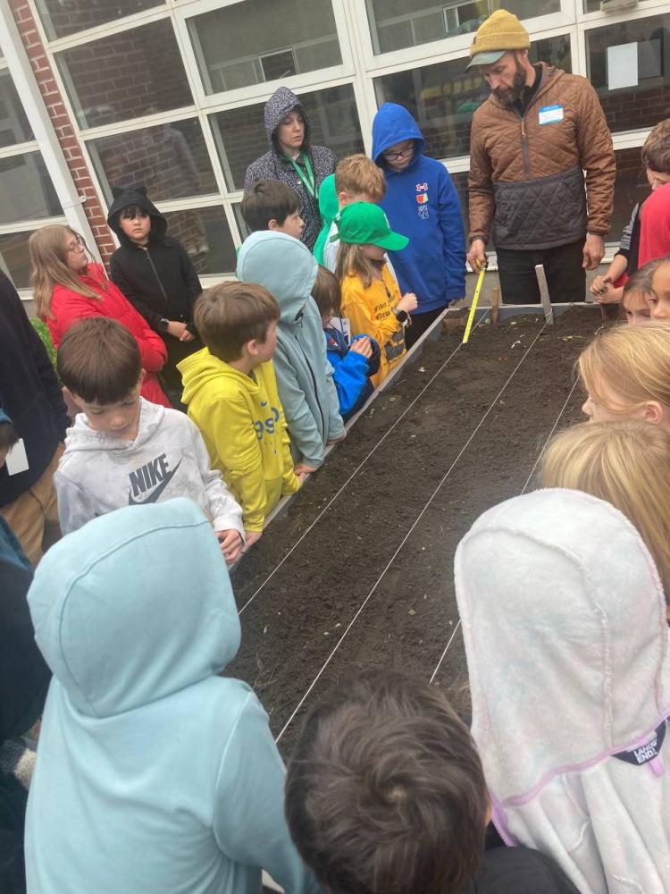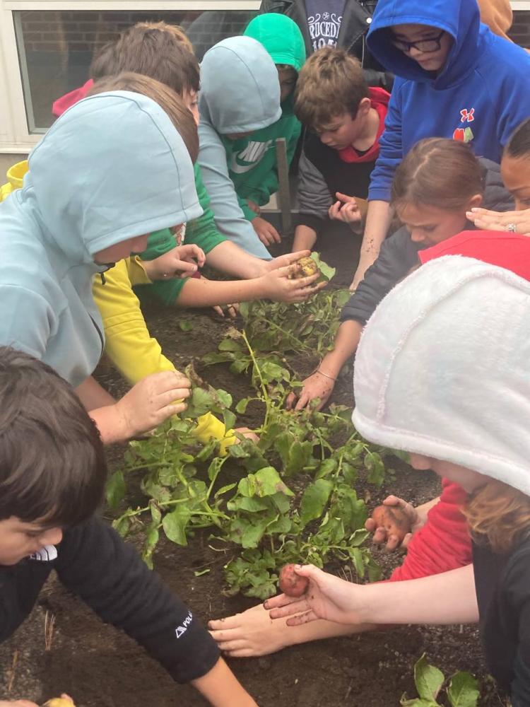 In the spring and fall, students plant and harvest a variety of fruits and vegetables, including kale, peppers, potatoes, peas and garlic in addition to bushes and trees. Students learn about soil, pollination, worms and do taste tests.
