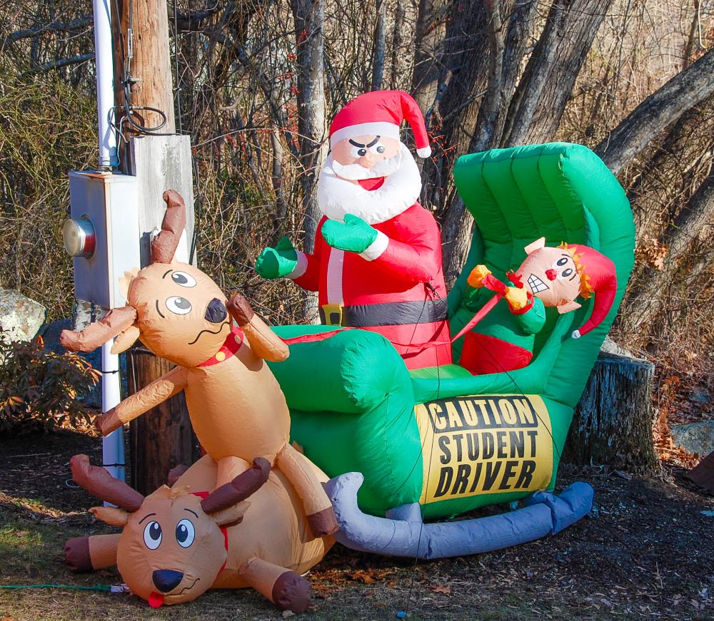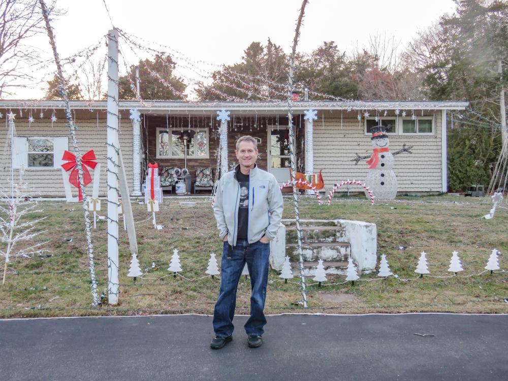 Carrier stands in front of his decorated home. Photo by Grace RocheAcross the Tri-town, residents have decked out their houses and yards with Christmas lights, blowups and other decorations.