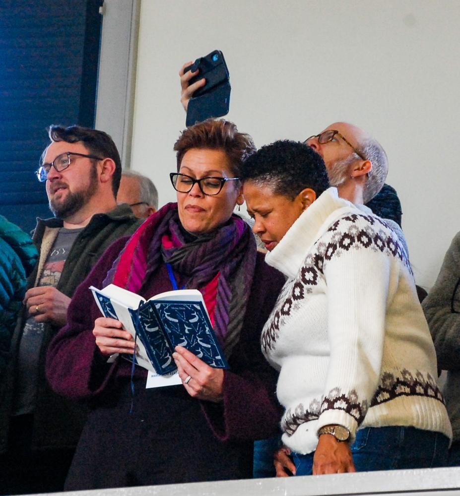 One reader looks over the balcony on a staircase in the packed room as the first chapter is read aloud.