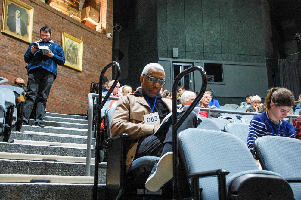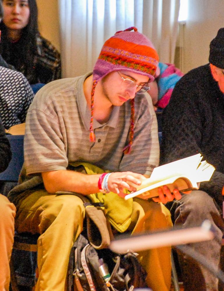 Ed Doherty reads along as he waits to read out loud at 7:30 am on Sunday, Jan. 3.