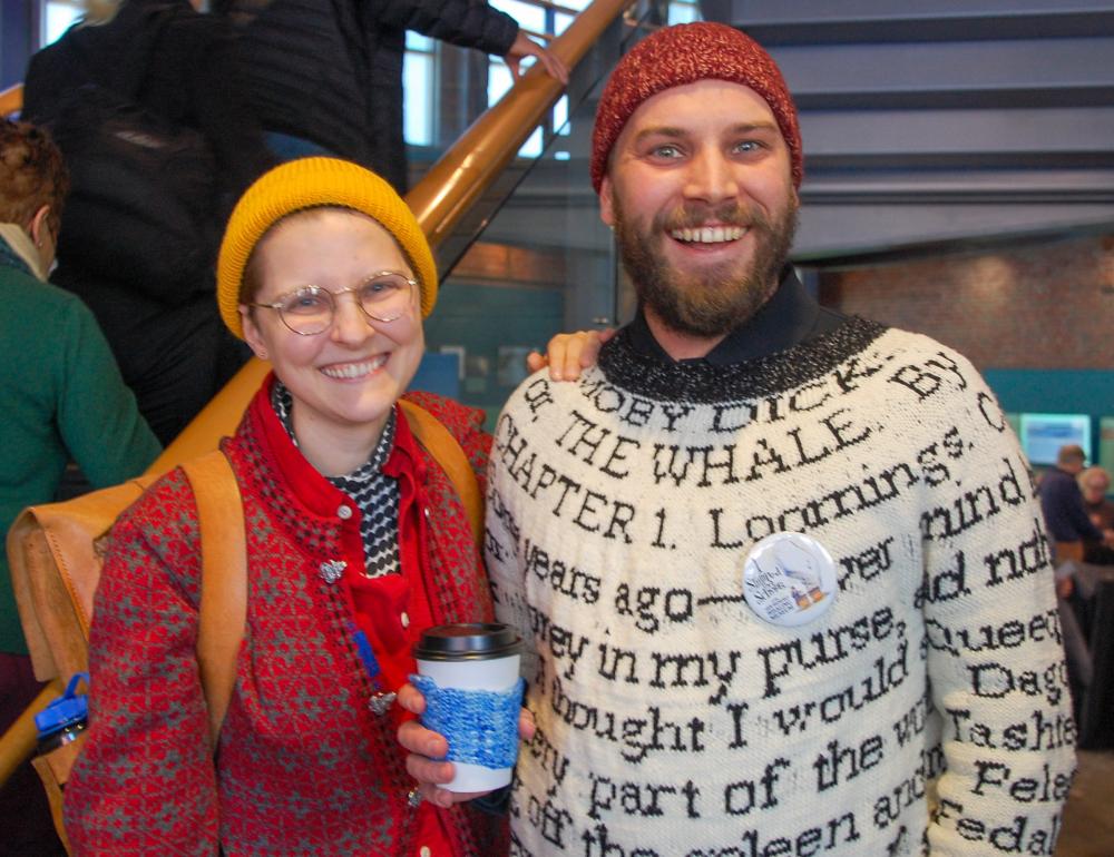 Sarah Kay Brimhall (left) and Derek Miller (right) from Brooklyn, New York have been attending the event every year for 3 years. Derek even got a much sought after "stump the scholar" pin with his question about "Moby-Dick". Photos by Mari Huglin