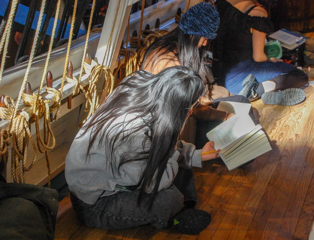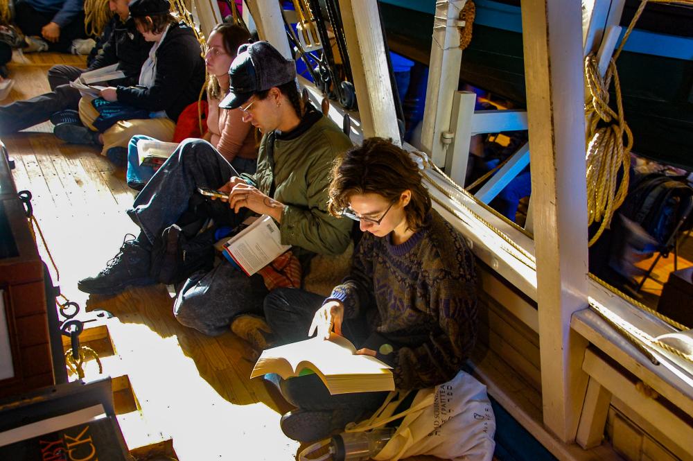 Readers found any spot they could to settle in for the 25 hours, even on the Lagoda, a boat inside the museum.