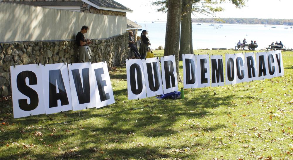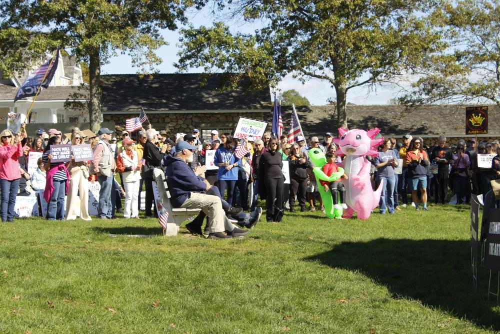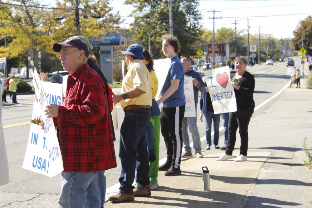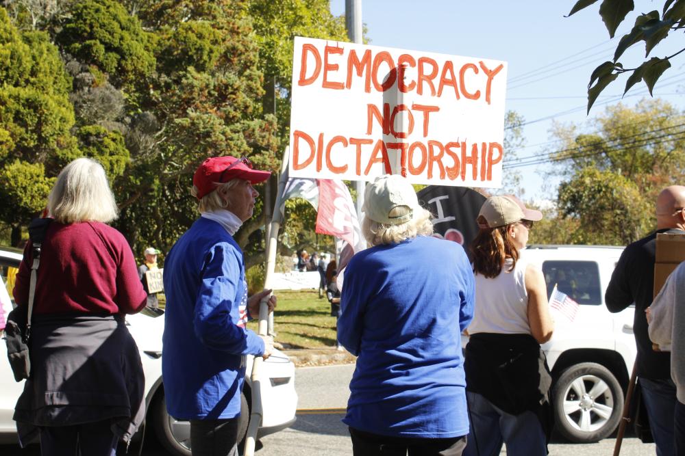 Protestors lined the sidewalks along North Street and County Road in Mattapoisett and chanted in support of democracy. Following the demonstration, participants marched to Shipyard Park where guest speakers shared their stories and a dance party concluded the event.