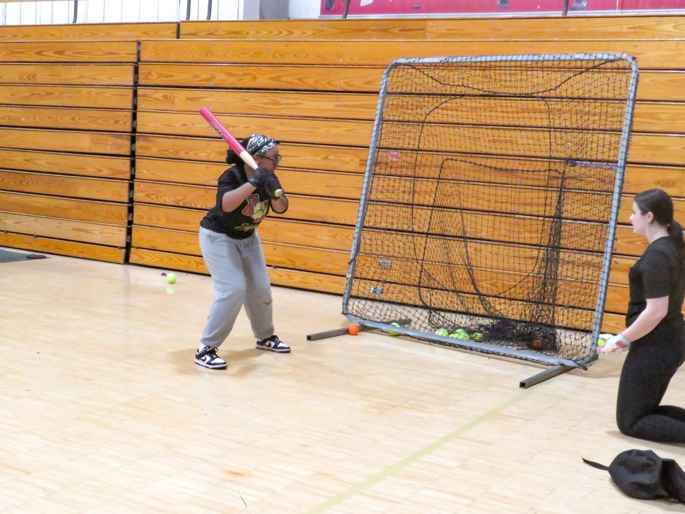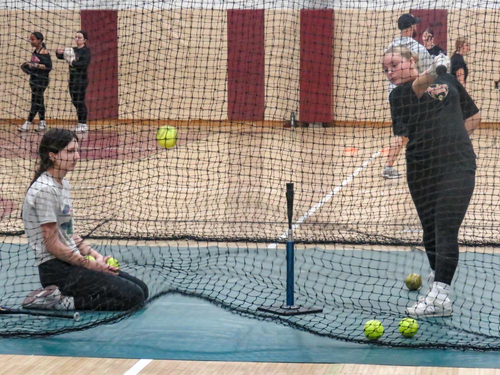 Emma Yelle and Shaylin Starkie practice batting. Photos by Grace Roche