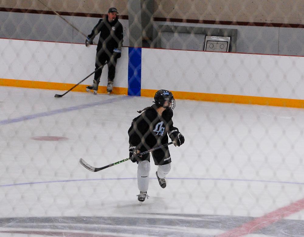 John Galavotti watches as Sam Long takes the puck up the ice.