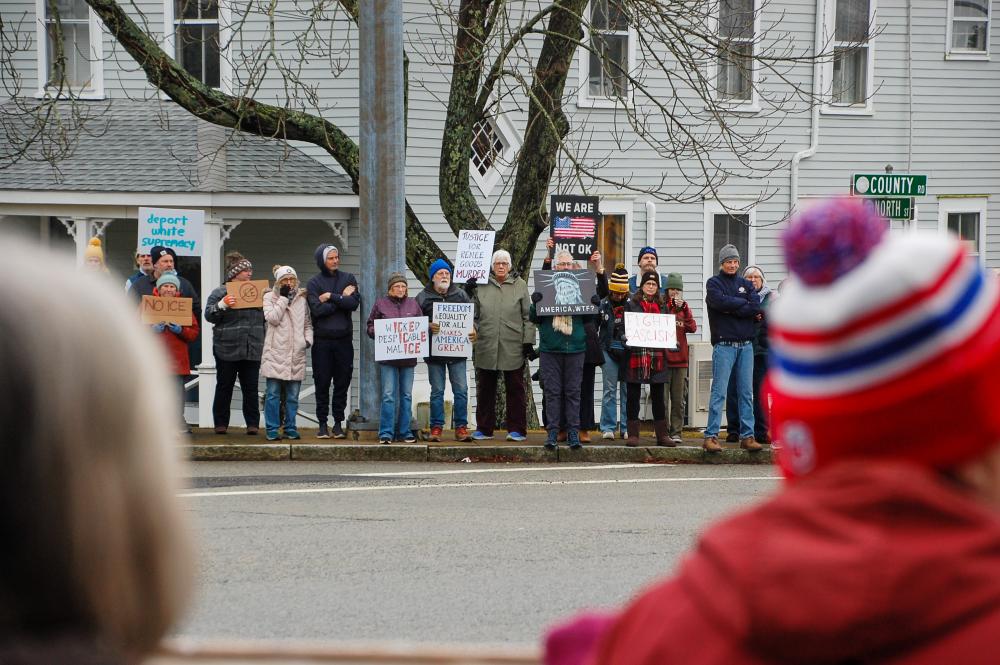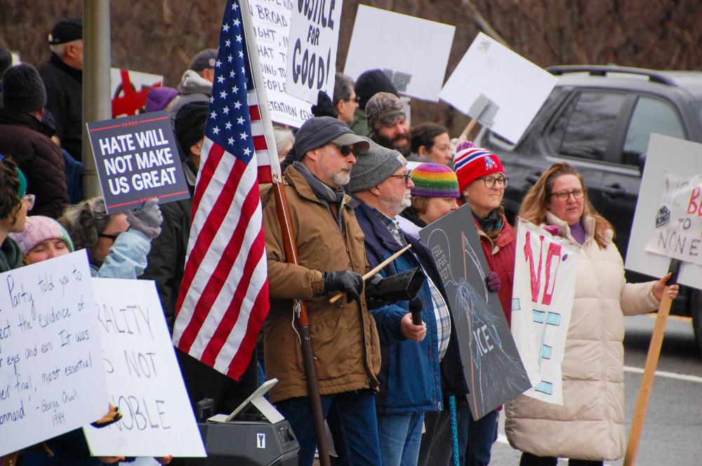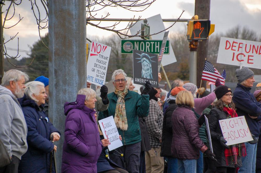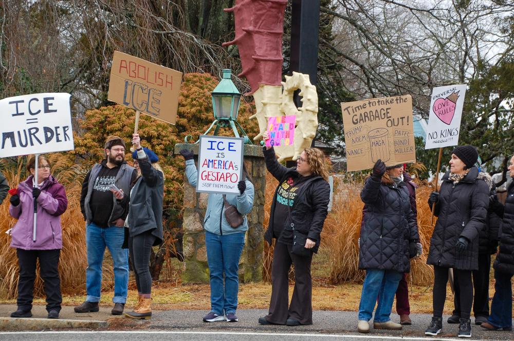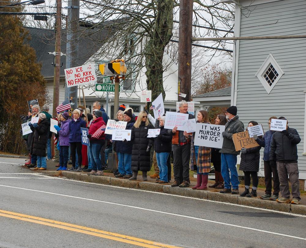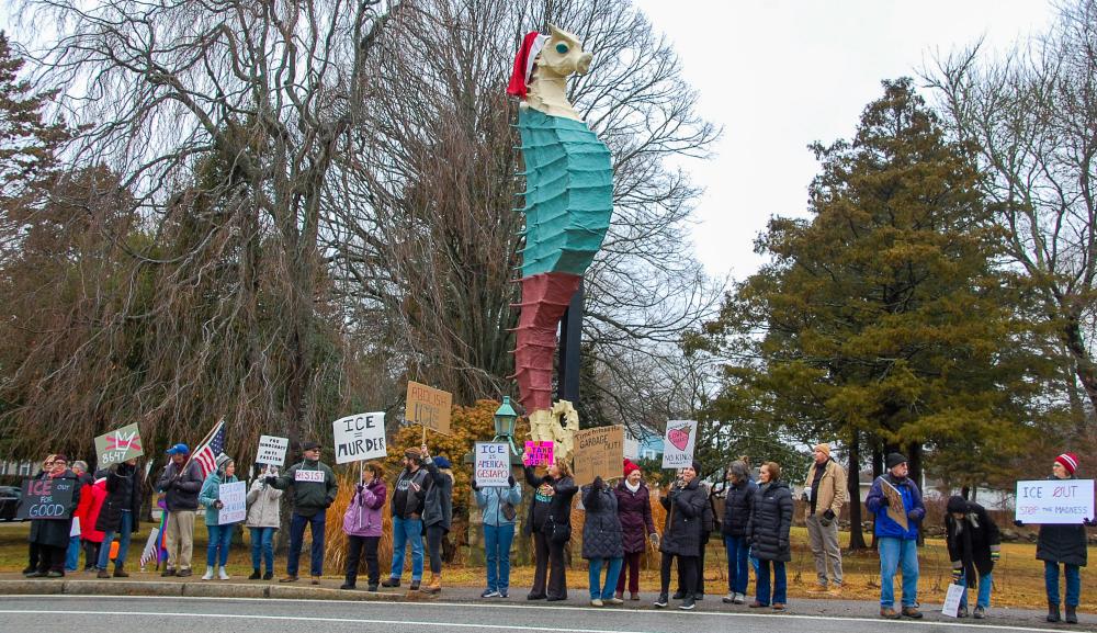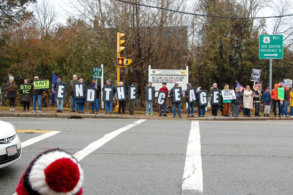 The four corners were full of protesters from across the South Coast.MATTAPOISETT — Over 200 people from across the South Coast showed up to an anti-ICE rally in front of Salty the Seahorse in Mattapoisett, Sunday, Jan. 11.