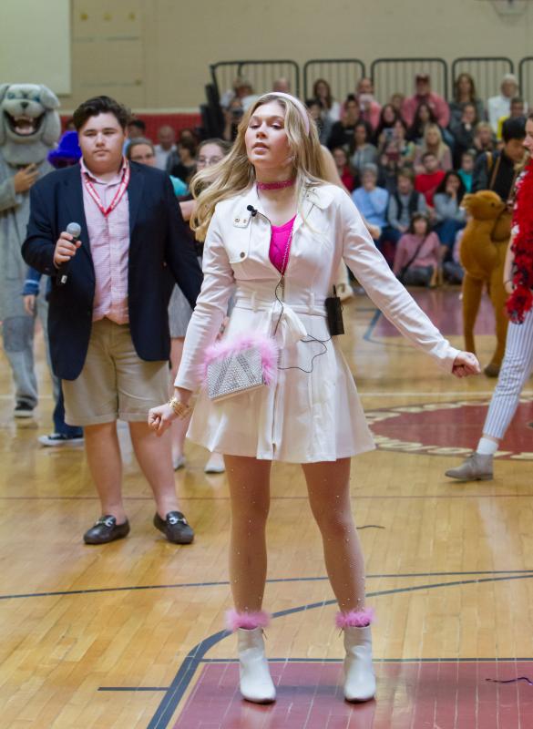 The Bulldogs Mascot holds up Senior Kate Marsden an antagonist from the seniors High School Musical Skit. Photo by: Andrew Griffith.