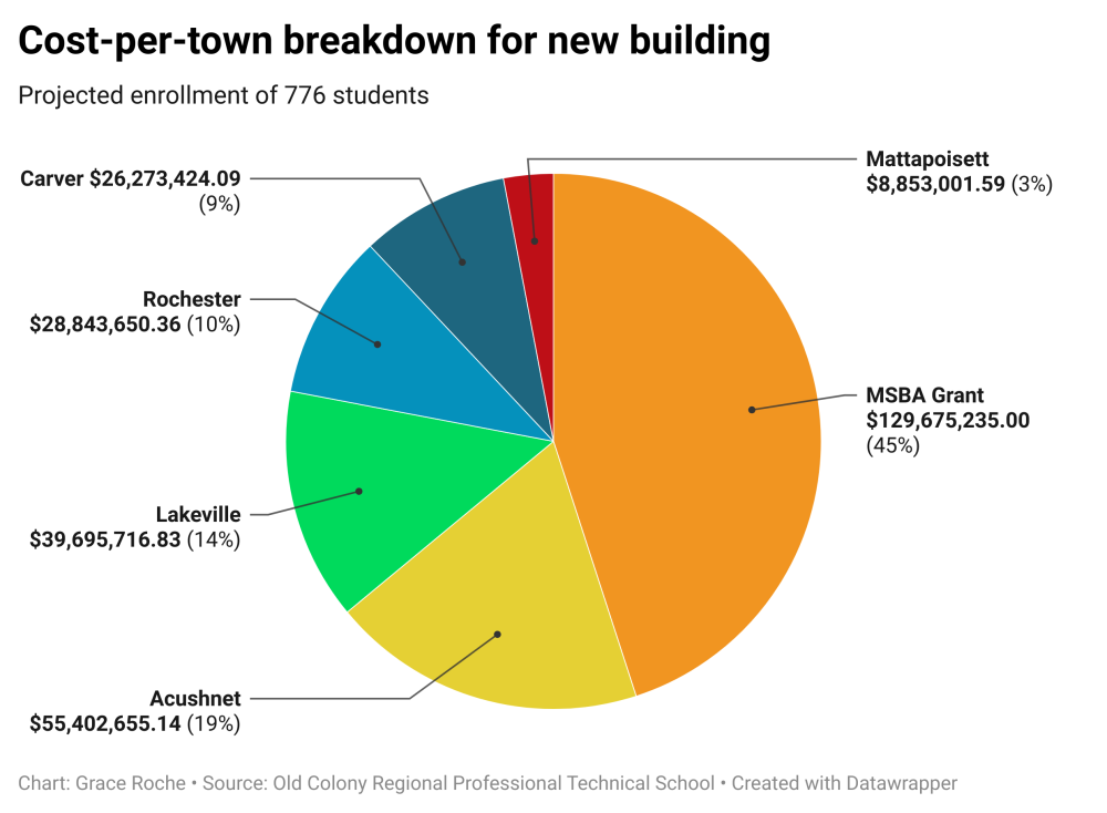 Achusnet would pay the most with an estimated 19%, since they send the highest number of students to Old Colony each year. Next would be Lakeville with 14%, Rochester with 10%, Carver 9% and Mattapoisett 3%.