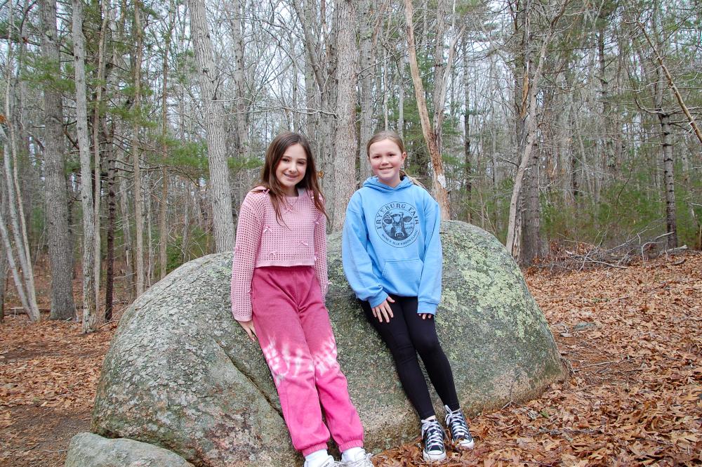 Maya Leech and Emily Collyer sit on a rock outside of Old Hammondtown.