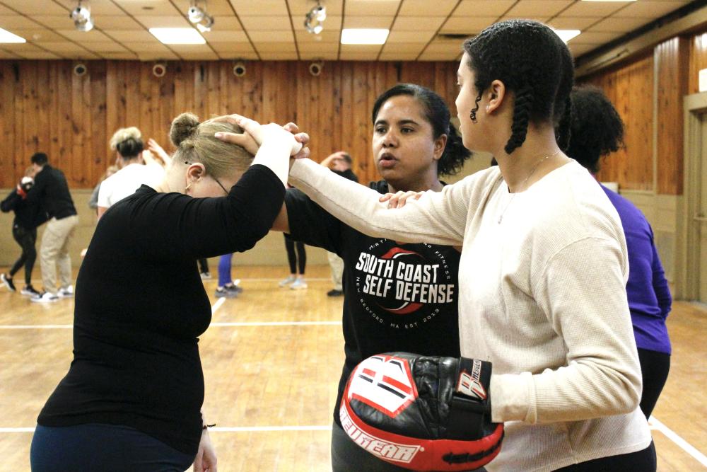 Mattapoisett Officer Linera Lima helps self-defense class attendees Leilani DePina and Joseline Lima learn how to defend themselves in a hair-pulling scenario in February. Photo by Grace Ann Natanawan