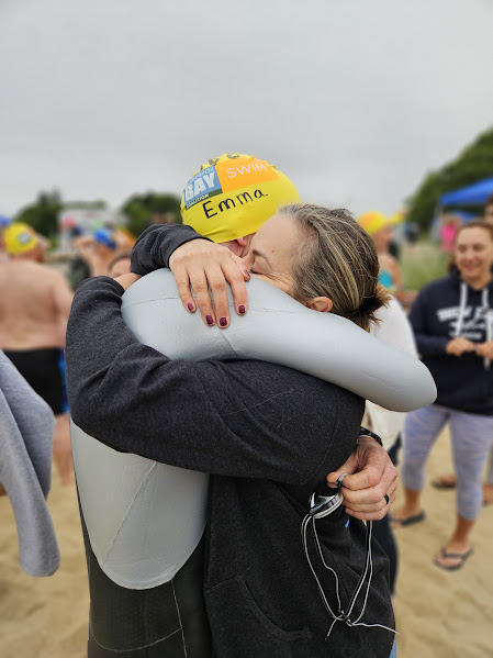 Emma Whittaker’s parents, Phil and Jess embrace after the Buzzards Bay Swim on Jun. 28. Emma’s parents continue to fundraise to support Buzzards Bay and the environment in her honor. Source: Rebecca Cusick
