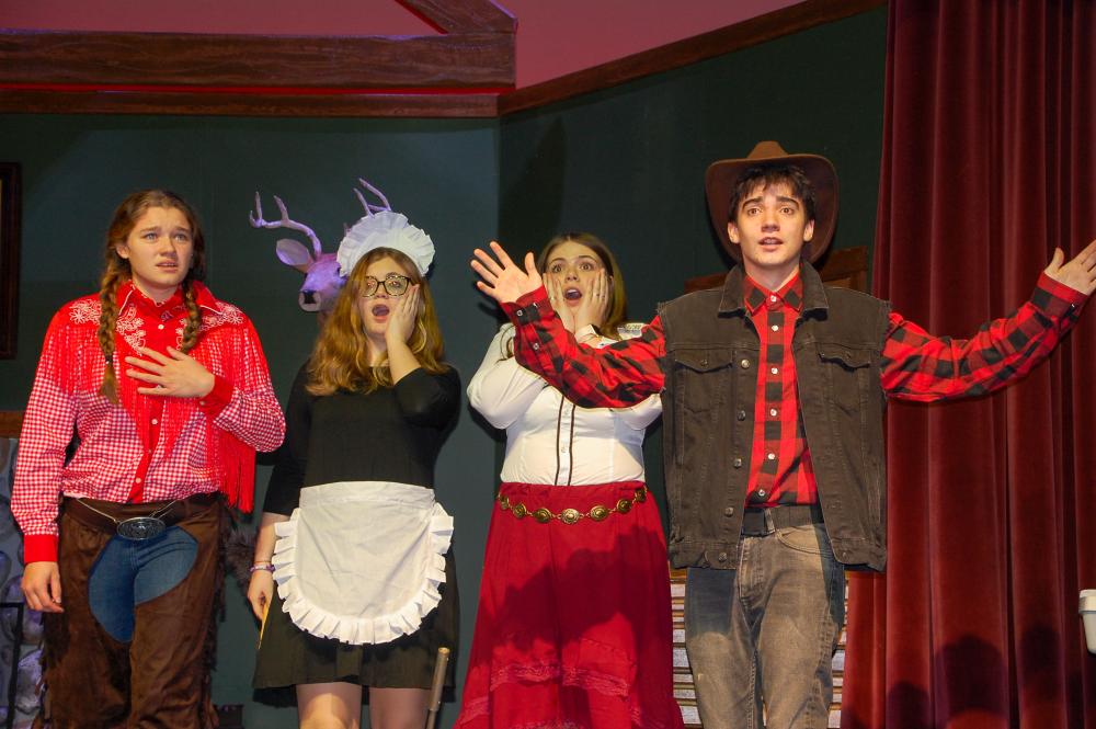 Tenley Lane, Gianna Anunziato, Amanda Tomasso and Lincoln Fauteaux are shocked at what they find on stage at a dress rehearsal of Old Rochester’s murder mystery inside a murder mystery play. Photo by Mari Huglin