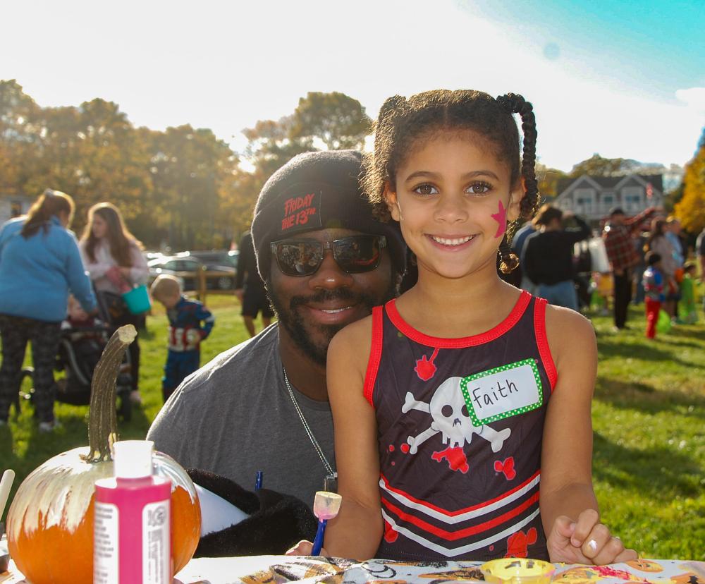 Faith, age 6, and Ray Leslie smile for a photo as they paint a pumpkin together at the Marion Trunk-or-treat on Oct. 25. Photo by Mari Huglin