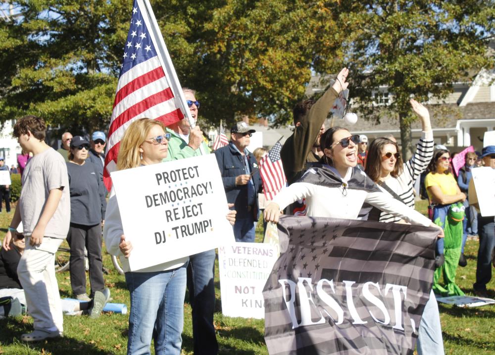 Emily Nugent of Mattapoisett holds a poster encouraging attendees to "Protect Democracy" while Avery Nugent holds a "Resist" flag at the Mattapoisett "No Kings" protest on Saturday, Oct. 18. Photo by Grace Ann Natanawan
