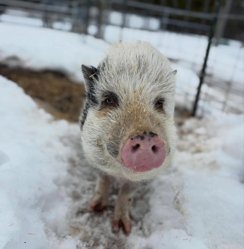 Poppy the pig frolicks in the snow. Image source: Pine Meadow Alpacas
