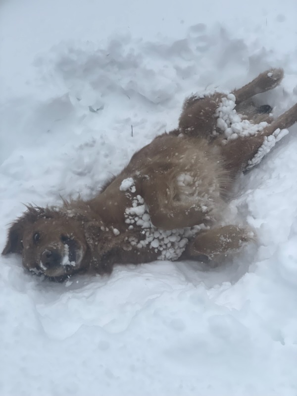 Charlie the golden retriever rolls around in the deep snow. Image source: Sarah Storer