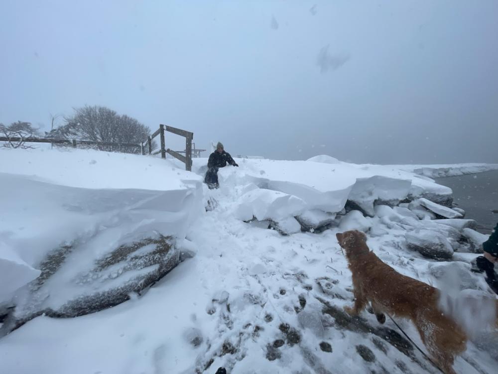 Charlie the golden retriever enjoys the snowy beach. Image source: Sarah Storer