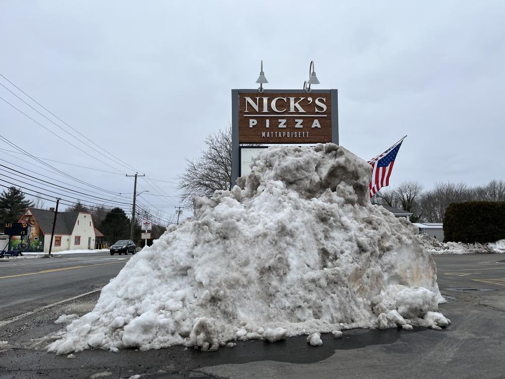 Nick's Pizza in Mattapoisett piled the rest of their snow into a large snowbank before the weekend storm. Photo by Mari Huglin