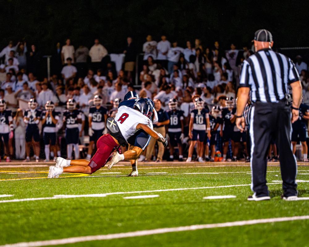 Carter Gooden makes a tackle. Source: Matthew BowcockMARION — Tabor Academy enrolls football players from across the world, catching the attention of high-profile coaches from Division I universities each season.