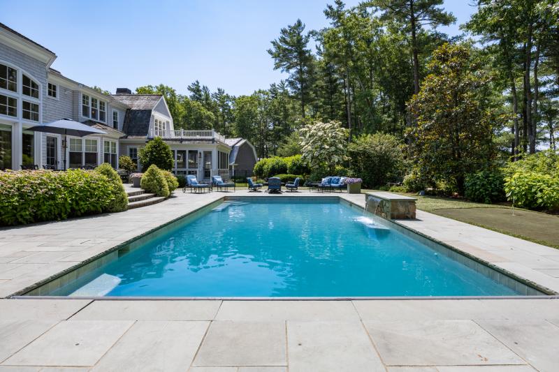 Live like you're on vacation at this spectacular Bay Club estate, where timeless design meets resort-style living. Privately situated on 1.58 acres with views of the 15th & 16th fairways, this custom home features a soaring great room with cathedral ceilings, fireplace and wet bar; a chef’s kitchen with Sub-Zero, Wolf and custom cabinetry; a richly appointed study, screened porch; and a serene first-floor primary suite with marble bath. Upstairs offers four en-suite bedrooms and a bonus game and theater room with a wet bar. The finished lower level includes a home office, wine cellar, playroom, executive closet suite, gym and sauna, offering extraordinary space for relaxation, recreation and entertaining. Outdoor highlights include a heated gunite pool, jacuzzi, pool house, and a custom-designed playhouse. A detached 3-car garage includes a 1088 SF carriage house complete with bedroom, kitchen, bath, laundry, private porch, and upscale finishes. Near the village, restaurants, beaches.